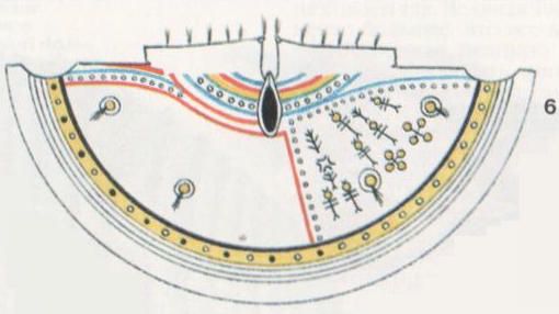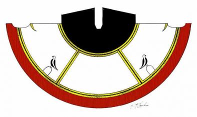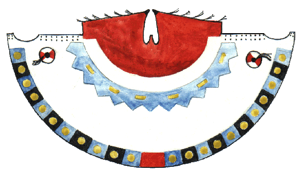 По нижнему краю покрышки обитатель типи рисовал нечто символизирующее землю, скажем полосу гор, прерию, камни, в-общем то, что он видит вокруг себя. Обычно это рисовалось красным цветом, цветом земли.