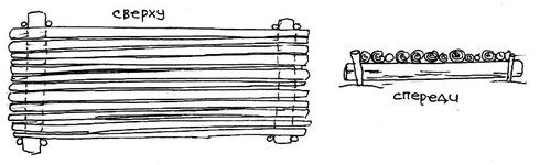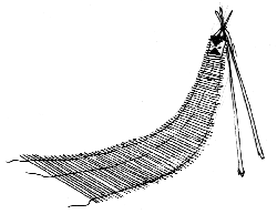 Подстилку, которую использовали индейцы на самом деле изготовить сложно, но кое-что можно объяснить. Делали ее из тонких ивовых прутьев, связывая их так, как показано на рисунке ниже. Тонкий конец ее подвешивался на треногу на удобную высоту. При надобности её выносили на улицу и использовали как кресло (любовались закатом солнца). Существует английское название "backrest". Это приспособление очень удобно сворачивается и мало весит.