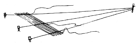 Все это время параллельно шесты обвязываются для прочности. Делается это так: берется хвост веревки, которой связана тренога, и один из ваших помощников, бегая по кругу, прихватывает установленные шесты веревкой. При этом полный виток делается на каждые три шеста (и на два последних). Удобнее это делать чуть-чуть подергивая веревкой, когда она охватывает розетку шестов, тогда она скользит при каждом рывке к узлу и плотнее к нему прилегает.
