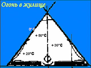 Треугольник от дождя. Маленькая, но очень полезная деталь. Во время сильного дождя тяга ухудшается, поэтому клапана нужно открыть пошире, но тогда внутрь будет заливать дождь. Чтобы голова, однако, совсем сухой был (извините, бум-шанкар попутал), вырежьте из плотной непромокаемой ткани равнобедренный треугольник, такой величины, чтобы он мог прикрыть очаг. Треугольник привязывается наверху, под дымоходом, на три шеста.