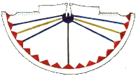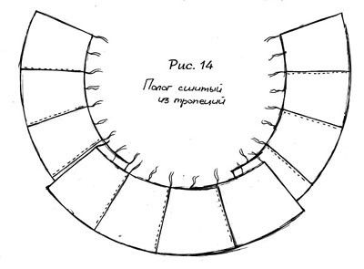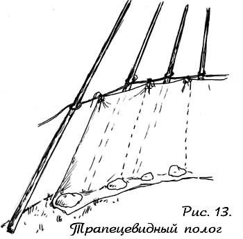 Полог трапецевидный. (Рисунок 13) Сшивается из широких трапеций. Поэтому в отличие от прямого полога его можно натянуть строго вдоль шестов. Обычно его делают из трех секторов (как видно на рисунке 14) и с таким расчетом, чтобы средний сектор накладывался внахлест на два крайних. Для справки - на 5-ти метровый типи требуется около 20 метров, а на 4,5 метровый - примерно 18..