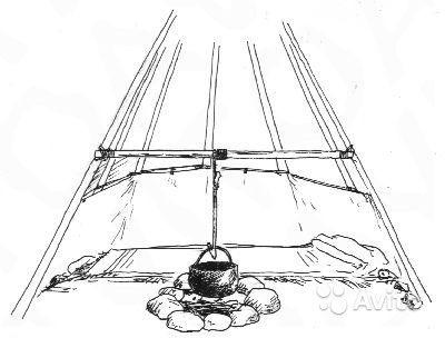 Вариант для небольших типи, где тренога неудобна - это привязанный над очагом поперечный шест, как показано на рисунке внизу. Крюк, подвешеный к этому шесту постарайтесь сделать подлинней, чтобы верёвка не перегорала. Верёвку выбирайте из натуральных материалов, иначе она плавно стечёт в ваш суп. В большом типи такие перекладины удобно использовать в качестве сушилок для одеял, одежды, трав, ягод и грибов. Кстати, одеяла с утра тоже хорошо бы просушивать. Независимо от погоды, внутри типи вы будете потеть во время сна, одеяла будут отсыревать, а вы обретёте запах монгольского воина.