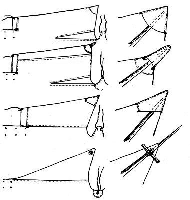 В лесу и степи клапана типи крепятся по-разному - в лесу, где нет ветра, нижние края клапанов могут свободно висеть или крепиться веревкой к покрышке, как показано на рисунке 1, а в степи для того, чтобы ветер не рвал клапана, их нижние концы обычно привязываются веревкой на отдельно стоящий шест (см. на рисунке 1)
