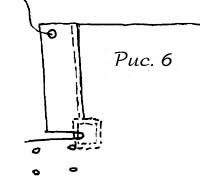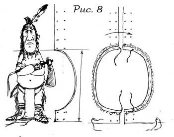 Высота входа должна находиться примерно на уровне плеча , начиная от края покрышки. А вырезать его нужно отступив сантиметров 20 , которые приходятся на порог. Глубина выреза - где-то 2 ладони. Обе половинки оторачиваются полосой крепкой ткани под которою просунута веревка (см. рисунок 8). При установке типи концы веревки связываются, чтобы не слишком растягивался вход. Если же покрышка из грубой ткани, типа парусины, вполне хватит одной оторочки, без веревки.