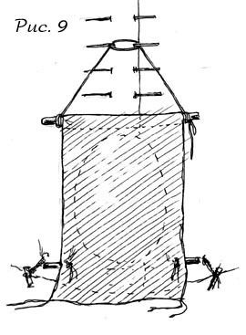 Простая дверь (рис. 9) делается из прямоугольного куска ткани с солидным запасом на низ (чтобы прикрыть порог) и по бокам. Верхний край подгибается и прошивается так, чтобы можно было засунуть туда палку для сохранения формы двери, чтобы висела ровно. Отступив от нижнего края двери примерно две ладони, привяжите вторую палку для отвеса, а на нижнем крае двери - шнурки или петлю, которыми на случай сильного ветра закрепляется на колышки дверь . |