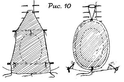 Пример замороченной двери - рисунок 10. Ее можно сделать либо из большой шкуры, либо из куска ткани, вырезанного приблизительно по форме шкуры. Это трапецеобразная дверь с длинным язычком на верхней части, который прикалывается к покрышке одной из деревянных палочек-"застежек". Язычок лучше сделать как можно длинней, чтобы подвесить дверь повыше - так она будет удобнее откидываться. Другой пример замороченной двери - дверь с ивовым каркасом овальной формы, которую вы видите в правой части рисунка 10.
