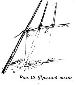 Потом вешается полог, начиная от входа и закрывая его первым своим сектором, так чтобы края задергивались, как занавески. Низ полога придавливается изнутри тяжелыми предметами (камни, рюкзаки, томагавки, гости и т.п.)