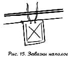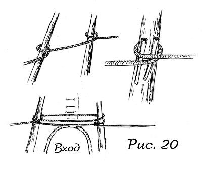 Начинать лучше от шеста с покрышкой. Под каждый виток веревки подсовывается пара палочек, это маленькие, но очень священные палочки и если вы не придадите им никакого значения, то во время дождя, по шестам будут стекать гулкие потоки воды, низвергаясь с жутким рокотом прямо вам на кровать. Способ завязки см. на рисунке 20.