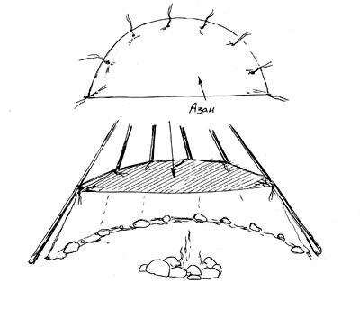 Ближний ко входу камень при необходимости отодвигается в сторону, чтобы кое-кто, о ком мы обычно пишем зеленым цветом, мог заходить (и еще это полезно, когда вы топите длинными жердями или бревнами). В некоторых индейских типи этот камень был всегда отодвинут.