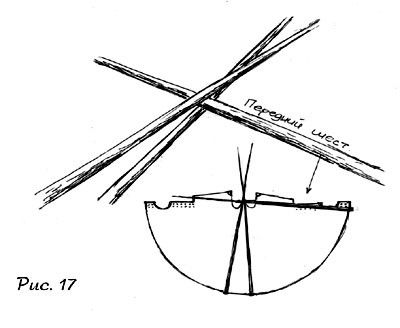 Для этого расстелите на ровном месте покрышку, положите на нее три шеста. Шесты крадутся (это опечатка, но если вам лень идти в лес, то это не опечатка)... Итак, шесты кладутся толстыми концами вровень с краем покрышки, а тонкие концы связываются вместе на уровне язычка (язычок - см. отдел Клапана, рисунок 7). Учитывайте, что если типи сиукского покроя (то есть задняя стенка короче) то два шеста связываются по высоте задней стенки и один по высоте передней (рисунок 17). Сделайте на шестах засечки, чтобы не съезжал узел. Кстати, если собираетесь обвязывать весь каркас, свободный конец веревки должен быть очень длинным. Теперь торжественно водрузите связаную треногу (тонкими концами вверх)!