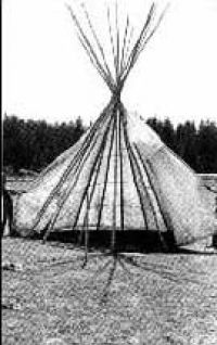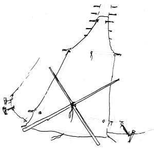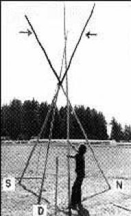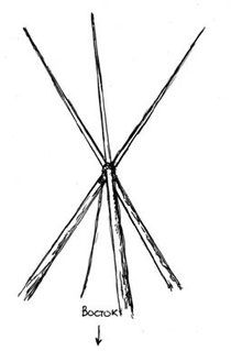 С этого момента начинается самая запарная часть. Тренога ставится одной ногой на восток (у сиукской типи это будет длинный шест). В дальнейшем эта нога станет шестом справа от входа. Две оставшиеся ноги треноги отставляются на равное расстояние. Треногу надо ставить так, чтобы дверной шест лежал в развилке между двумя соседними. | ![]() |