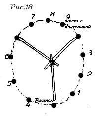 Затем к последнему шесту привязывается покрышка крепко- накрепко и притом так, чтобы нижний конец шеста выступал за край покрышки примерно на ладонь. Все это хозяйство поднимается и шест ставится на свое место. Если у вас тяжелая покрышка, то лучше делать это не одному. Для этого лучше перед поднятием шеста собрать к нему покрышку гармошкой и потом, когда шест поднят, два человека берутся за края покрышки и начинают расходиться, оборачивая ею каркас так, чтобы вход находился между восточным треножным и шестом номер 4 на рисунке 18. Покрышка скрепляется застежками сверху вниз. После этого можно раздвинуть шесты, чтобы ткань натянулась и плотно облегла каркас.