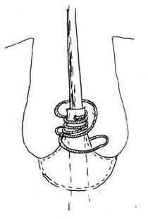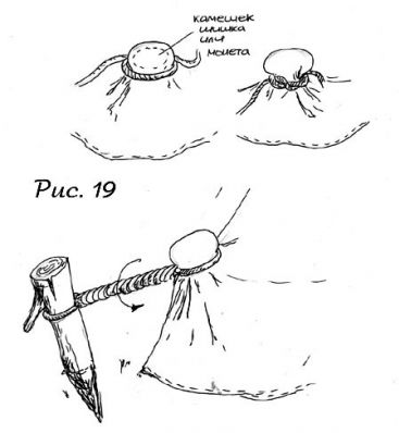 Далее по периметру типи привязываются веревочки, в середине между каждой парой шестов (см. на рисунке 19). Берется маленький камешек, шишка или еще что-нибудь круглое, оборачивается тканью покрышки, отступив от ее края на ширину ладони и обвязывается плотно веревкой так, как показано на рис. 19. Дополнительно привязываются две завязки по обеим сторонам от входа, около шестов. Теперь покрышка прихватывается к земле колышками.