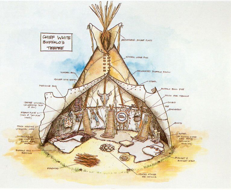 Вход в типи - на востоке, а у дальней стенки типи, на западе, находится место хозяина. Южная сторона - это сторона хозяйки и детей. Север - мужская половина. Там же располагаются обычно почетные гости.