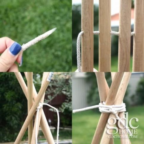 Из длинных шестов (можно использовать клапанные шесты соседского типи) сделайте себе сушилку для одеял. Это просто большая тренога с перекладинами между шестами.