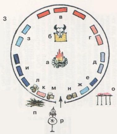 а) очаг; б) алтарь; в) мужчины; г) гости-мужчины; д) дети; е) старшая жена; ж) бабушка; з) родственницы и гости-женщины; и) жены хозяина; к) дедушка или дядя; л) вещи; м) продукты; н) посуда; о) сушилка для мяса; п) дрова;