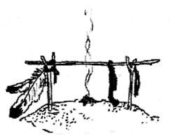 Если вы рассчитываете жить в типи долго, а стало быть общаться со всем тем, что живет в типи вместе с вами, то можете сделать себе большой алтарь. Делается он так: перед большим алтарным камнем насыпается горка песка (песок чище земли, он может отражать солнце, поэтому подходит лучше всего). По краям втыкаются две маленькие деревянные рогатины, поперек кладется тонкая палочка. Ее можно украсить лоскутами ткани, тесьмой, индейцы предпочитали красный цвет и вешали на нее перышки птиц, дикобразовые иглы.