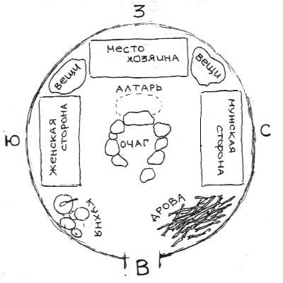 На рисунке внизу зарисовано расположение мест и предметов в типи.