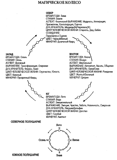 Существуют фундаментальные энергетические различия между северным и южным полушарием, которые могут повлиять на ваше магическое колесо. Однако вышеописанное магическое колесо очень легко приспособить для южного полушария. В северном полушарии энергия движется по часовой стрелке, а в южном — против часовой стрелки. Потому в южном полушарии следует передвигаться в противоположном направлении. В северном полушарии север является обителью холода, зимы й тьмы, тогда как в южном полушарии таковой является юг. Вот почему аспекты севера и юга меняются местами в зависимости от того, в каком из полушарий вы находитесь.